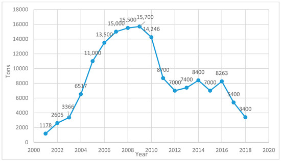 Figure 5 shows that the quantities collected have decreased considerably since 2009, reaching only 5400 tons in 2017 and 3400 tons in 2018.
