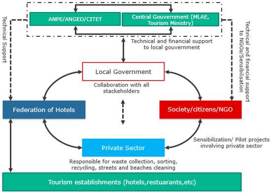 In this paper, a proposed alternative model for the provision of SWM in tourist destinations in Tunisia is presented. The model shown in Figure 7 depicts the involvement of all stakeholders in most SWM procedures. Municipalities would be the main actor involved in managing solid waste; however, in terms of its implementation, the local government should cooperate with national authorities (tourism and environment ministries), the private sector (hotels, collection, sorting, and recycling companies), NGOs, and local citizens to formulate policy and create an appropriate SWM system.