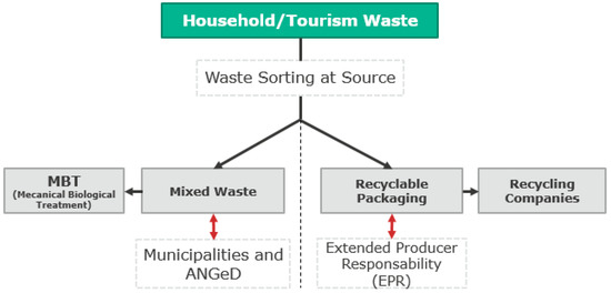 In cases of mixed solid waste generation in tourism destinations (households, hotels, and so on), the municipality is responsible for collection and transportation. In rare cases where the waste generator sorts their waste, two types of solid waste are eliminated: residual waste (collected by the municipality) and recyclable waste such as paper, cardboard, plastics, metals, and glass (collected by private companies or informal collectors).