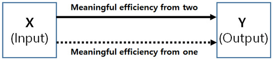 In Figure 2, the input keyword X affects the output keyword Y by two results of the additive model and directional distance function. The solid line shows a meaningful efficiency in both models, and the dotted line shows a case in which only one model has significant efficiency. That is, the solid line shows a greater influence. We can build this structure between all the keywords related to the target technology. The following procedure summarizes the proposed method described above.
