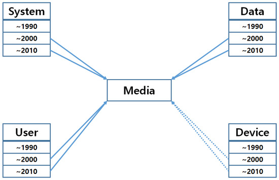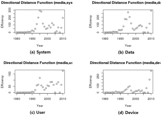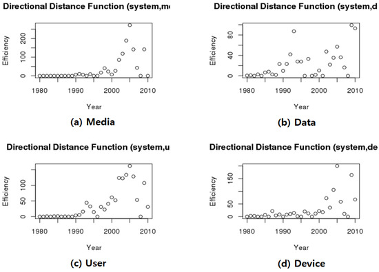 The solid line shows efficiency in both the additive model and directional distance function, and the dotted line shows efficiency in one of the two results. Therefore, system technology was continuously influenced by the media technology, and it can be seen that it was affected by user and data technologies recently. Next, the results of the additive model in which the Y variable is the media and the X variables are system, data, user, and device are shown in Table 2.