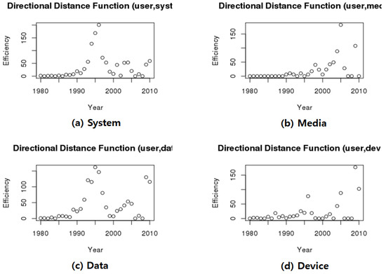 According to the additive model result in Table 4, comparing data with the system, the primary growth trends were similar. There was no efficiency in the first 10 years, but after 1990, it increased and peaked in 1995, before decreasing to zero. The main difference was that the data variable increased stability, but the system variable showed increased fluctuation from 2000 to 2005; after 2005, the data variable multiplied, but the system variable increased slowly. The device variable appeared to show inefficiency before 2010 before demonstrating a sudden increase in influence in 2010. For the media variable, the first 10 years were efficient, and the growth rate fluctuated until 2010; the peak occurred around 2005. In addition, we visualized the result of the directional distance function for the user variable in Figure 9.