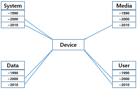 In Figure 10, it can be observed that the technology of the media affected the technology of the user continuously. Since 1990, system and data technologies have had strong impacts on user technology. On the other hand, it can be seen that device technology had a weak influence on user technology after 2000. Lastly, we show the results of the additive model for device (Y variable) in Table 5.