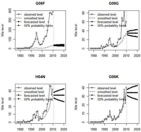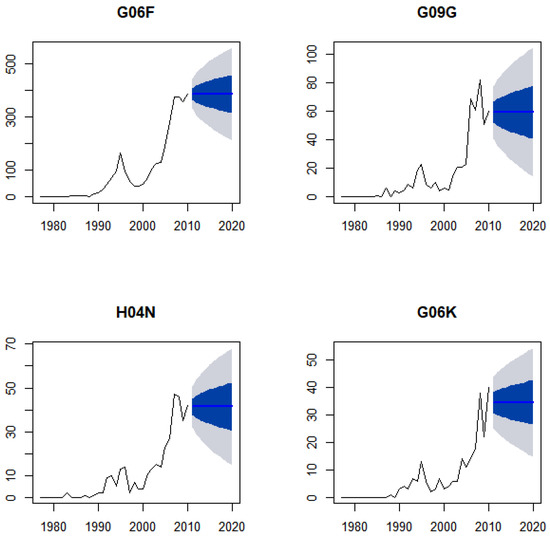 We know that prediction errors have been getting bigger in recent years than in the past. A large error means that the risk is high. However, from a sustainability point of view, it is necessary to constantly manage technological areas with a large error (risk). In the results of Figure 14, we found that the technological risks of H04N and G06K were larger than those of the other IPC codes. So, we should manage technologies based on H04N and G06K. Lastly, we present the sustainability forecasts for the four IPC codes using the forecasts and probability limits via the SSM in Figure 15. From the results of Figure 13, Figure 14 and Figure 15, we found that technologies based on H04N and G06K are important for the sustainability of Apple’s technologies.