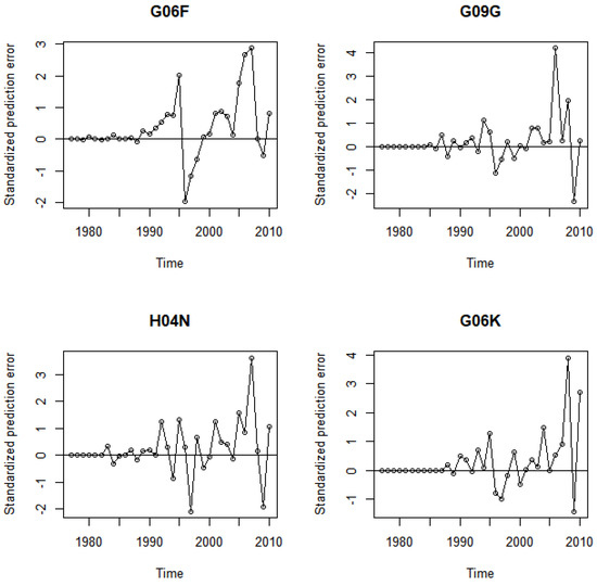 The forecasted levels of G06F and G09G were smaller than the observed levels. In addition, the forecasted level of H04N did not reached the observed level. In comparison, the forecasted level of G06K tended to increase compared to the observed level. From the result show in Figure 13, we know that Apple should keep sustaining technology based on G06K to increase technological competitiveness. We also show the prediction errors of the four IPC codes in Figure 14.
