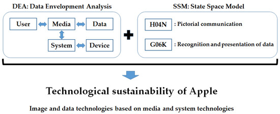 In this study, we proposed a methodology consisting of two models, DEA and the SSM, to analyze the technological relationship of the target technology. We used patent keywords and IPC codes extracted from patent documents for the proposed methodology. The target domain of our case study is Apple technology, because Apple is one of the leading companies in the technological innovation markets. We considered Apple’s top five keywords (system, data, user, device, media) and four IPC codes (G06F, G09G, H04N, G06K) in our case study. Of course, the list of keywords used by the analyst can be changed, but the method of constructing the technological structure between given keywords can follow the proposed steps in this paper. Using the results of DEA, we found technological relationships between sub-technologies (patent keywords). In addition, we forecasted the future trends of sub-technologies (IPC codes) via the result of the SSM. In the DEA result, we could see that technologies based on ‘media’ and ‘system’ are connected to each other and others. This means that Apple needs to research and develop these areas for the sustainability of Apple’s technology. Furthermore, via the SSM result, we confirmed that technologies based on H04N (pictorial communication) and G06K (recognition and presentation of data) are important to Apple’s technological sustainability. Finally, by combining the results of the two analyses, we were able to identify ‘Image and data technologies based on media and system technologies’ as Apple’s sustainable technology.