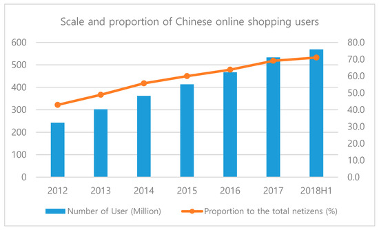 The popularity of online retailing has brought huge opportunities and challenges to retailers. By June 2018, the number of Chinese netizens reached 802 million, and the number of new Internet users in the first half of 2018 was 29.68 million, an increase of 3.8% compared with 2017 (Zhiyan Consulting Group). The Internet penetration rate was 57.7%. As shown in Figure 1, in the first half of 2018, the size and proportion of online shopping users in China showed that the number of users was 568.92 million, an increase of 35.6 million compared with the end of 2017, accounting for 71% of total netizens. This rapid growth in both Internet and online shopping users in China provides business opportunities to Chinese online shopping companies.