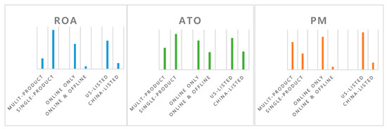 Figure 2 describes the univariate comparisons between Multi/Single product, Online/Offline store, and US/China listed groups, respectively, with respect to ROA, ATO, and PM. Three figures are based on the mean values of each category. In every three performance measures, online only and US-listed groups are superior to offline and China-listed groups. However, multi-complex product groups have a higher PM and lower ROA and ATO compared to single product groups. Since these comparisons do not control for other company characteristics, we are cautious about interpreting and generalizing the results.