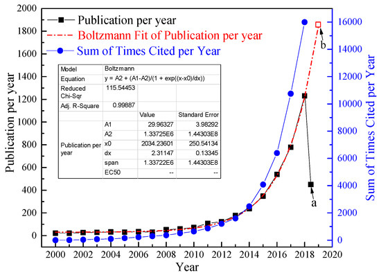The cumulative progression of Figure 2 illustrates the obvious increase from 2000 to 2018. Although the time coverage of core collection of the WoS was 1986–present (last updated May 08, 2019), only the years when the annual publication output of smart cities research was over 10 were summarized. To clarify, there were three papers that focused on intelligent traffic; one paper was published in 1998 and two papers were published in 1999 [35,36,37]. Related to the operation of the smart city projects and supported by the European Union since 2010, the number of publications regarding smart cities considerably increased [38,39]. In the meantime, up to May 8, 2019, there were 450 papers published in 2019. By utilizing a nonlinear fit [40] (Boltzmann model, see Figure 2. R2 = 0.9989) of publications from the year 2000 to 2008, the predictive publications of 2019 were calculated as 1862. It could also be predicted that the quantity of the scientific papers on smart cities research will increase at a high speed in the near future.