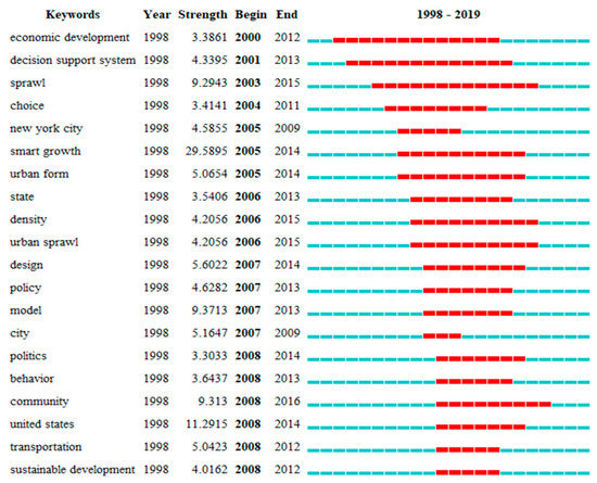 Keyword citation bursts refer to those keywords which increase sharply in citations. Burst detection is a useful analytic method to find the keywords that receive particular attention from the related scientific communities in a certain period of time. Therefore, several interesting points could be found by analyzing the results given by CiteSpace [44]. In this section, to explore the dynamics of smart city research, and to explore the intensively researched directions, 20 bursts detected on the keywords were illustrated with CiteSpace (parameter settings: years per slice: 1; node types: keyword; top N per slice: 300. Top N%: 5%) as is shown in Figure 4.