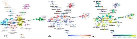 Authors cooperation network in smart city research. Note: (a) network visualization was based on author link-weights; (b) overlay visualization was based on author link-weights and citation scores; (c) overlay visualization was based on document-weights and average publication year scores.