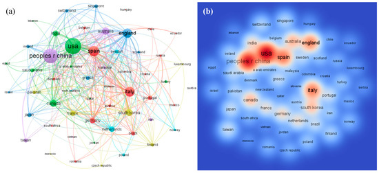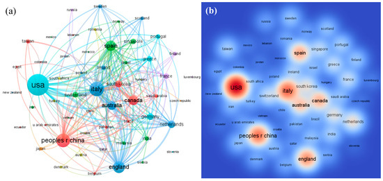 Co-author visualization map of countries/regions. Note: (a) network visualization map was based on document-weights; (b) density visualization map was based on document-weights.