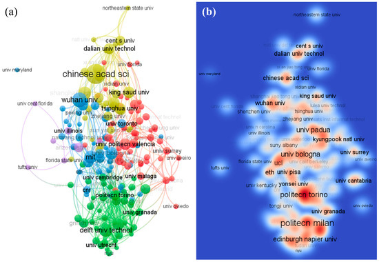The visualization map of research organizations on smart cities. Note: (a) organizational network visualization map was based on document-weights; (b) density visualization map of organizations was based on total link-weights.