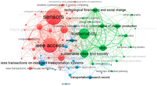 In total, there were 4409 publications in 1086 different journals. Although a lot of journals supported a wide variety of research themes and the multidisciplinary characteristics of smart city research, 55.34% (n = 601) journals had published no more than two publications. A list of the top 10 most productive journals on smart city research is provided in Table 1. In addition, the journal publications visualization map was produced with VOSviewer (Figure 10), so as to give a more direct impression of the journals.