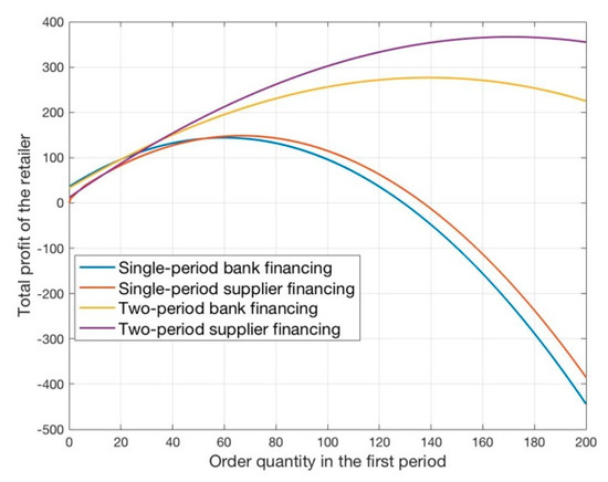 When and is fixed, Figure 4 shows the retailer’s total profit curves with the respect of the order quantity of first period under bank financing and supplier financing in single-period and two-period scenarios. It can be seen from Figure 4 that the retailer’s expected terminal profit functions under these four scenarios mentioned above are all concave with respect to the order quantity of first period as we prove in Section 4 and Section 5. Comparing the retailer’s expected terminal profit under single-period bank financing and supplier financing, when the order quantity is less than 52, the retailer’s profit of bank financing is higher than that of supplier financing, or retailer’s profit of supplier financing will higher than that of bank financing, and because in our initial setting, and are both higher than 52, which means that in this case, the retailer will select supplier financing that maximizes his terminal profit.