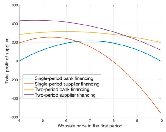 On the other side, Figure 5 shows from the supplier’s perspective the impact of the first-period wholesale price on the supplier’s expected terminal profit under bank financing and supplier financing in single-period and two-period scenarios. Compared with the supplier’s expected terminal profit under single-period bank financing and supplier financing, it can be seen that when the wholesale price is less than 6.47, the supplier’s expected terminal profit of supplier financing is higher than the bank financing, on the contrary, the bank financing will be better for the supplier. This is because when the wholesale price is low, the retailer’s optimal order quantity increases. If the retailer chooses the supplier financing, the supplier can compensate for the loss of profits caused by the reduction of the wholesale price or even bring higher profits by trade credit obligation and increasing order quantity. However, when the wholesale price is too high, the retailer’s order quantity will decrease, which leads to a decrease in the supplier’s terminal profit. It also can be seen from Figure 5 that , which is lower than and at that time the supplier’s expected terminal profit under supplier financing is 257.7, which is higher than that of bank financing, which is 216.