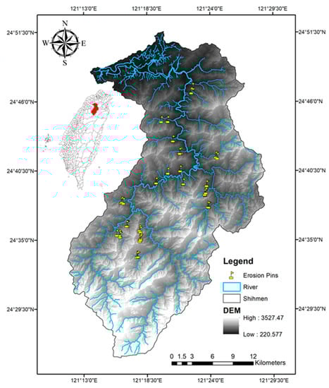 In the Shihmen Reservoir watershed, Chen et al. [] used the Universal Soil Loss Equation (USLE) model to compare soil erosion under four different Digital Elevation Models (DEMs). The result shows that the amounts of soil erosion were different from four different DEMs. It varies between 61.0 t/ha/year and 95.5 t/ha/year. Apart from this, using erosion pins is a simple and effective method to monitor erosion in gullies and hill slopes by assessing the soil loss (erosion depth) temporally and spatially [,]. Edeso et al. [] evaluated the average soil loss in northern Spain using 29 erosion pins. The pins were installed from July 1993 to September 1994 in areas such as conventional harvesting management plots, harvested plots, and down-slope deep plowing plots. From erosion depth results, it was shown that the soil loss across all types of plots increased. Erosion pins and 137Cs (Caesium-137, a radioisotope used as field evidence to quantify eroded or deposited soil) were deployed to quantify soil erosion and sedimentation rates at Grafton, New South Wales []. Results showed that among the 94 pins, 46.8% exhibited signs of erosion, 48.9% of deposition, and 4.3% did not exhibit any soil changes. In Taiwan, Lin et al. [] used erosion pins to evaluate and compare the effect of rainfall on soil erosion in two sub-watersheds of the Shenmu watershed. The result showed that the soil erosion depth quickly increases when the accumulated rainfall is higher than 200 mm.