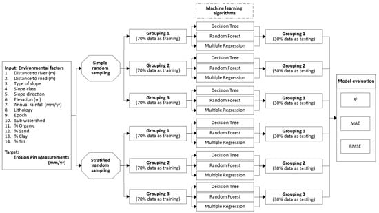 Normally, the simple random sampling method is employed to determine a random selection of data from an entire population under 70% of training and 30% of testing. However, this study also applied the stratified random sampling method. In contrast to the simple random sampling method, the stratified random sampling method divides the entire data into small strata based on their characteristics and performs simple random sampling within each stratum to avoid missing representative data in the training or testing data set. For this study, the attribute sub-watershed was chosen as the stratum. This is supported by Chen and Chen [], who indicate that erosion depth shows significant differences between sub-watersheds. Then, each stratum (sub-watershed) uses simple random sampling to obtain 70% training and 30% testing data.