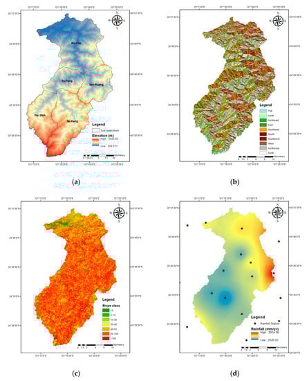Environmental factors: (a) Sub-watershed and Elevation, (b) Slope direction, (c) Slope class, (d) Rainfall station and average annual rainfall distribution.
