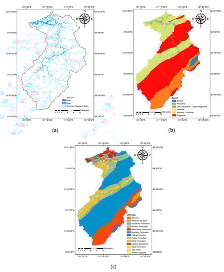 The river system data were provided by the Water Resources Agency in 2000, and the road system data by the Industrial Technology Research Institute from 2006 to 2008 on a scale of 1:5000 (Figure 4a). Using the Near tool in ArcGIS, the perpendicular distances between the slopes monitored by erosion pins and any rivers or roads were calculated. Lithostratigraphic units and Epoch were collected from the Central Geological Survey on a scale of 1:50,000 (Figure 4b,c). Finally, the percentages of sand, silt, clay, and organic content in the soil were collected from samples in the Shihmen reservoir watershed []. The three types of slope vegetation phases in the watershed are natural, bare, and remediated. These data were collected by field surveys.