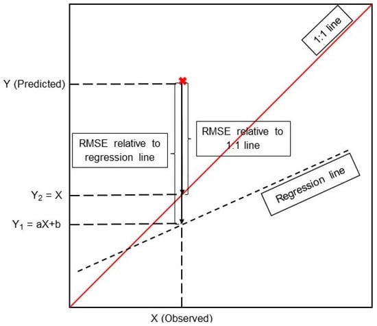 RMSE and MAE are both commonly used to evaluate the error of models between the observed and predicted data based on the regression line or the 1:1 line, and both show the average model prediction error in units of the variable. The value can range from 0 to infinity, with lower values being better. Figure 5 shows the difference between RMSE relative to the regression line and the 1:1 line. It can be seen that the RMSE relative to the 1:1 line is the prediction error between the predicted value from the model and the observed value (Equations (3) and (4)). On the other hand, the RMSE relative to the regression line is the prediction error between the predicted value and the value from the regression line (Equations (5) and (6)). Note that it is the 1:1 line that is important in the evaluation of machine learning models because the 1:1 line indicates that the predicted value is the same as the observed value.