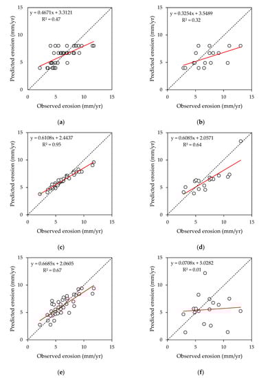 Multiple regression is the baseline model to evaluate the other two machine learning models. Multiple regression, which is commonly employed in various analytical studies, is a statistical model that predicts the erosion depth (Y) established by the values of the 14 predictor variables (Xi) and is used to evaluate the other two models by comparison of results. The average errors of the models were represented by the RMSE relative to the 1:1 line, which is the square root of the average squared differences between the predicted and observed values. The average RMSE of the multiple regression analysis in the training data is 1.44 mm/yr, but the average RMSE of the testing data is increased to 2.10 mm/yr. Further, the average RMSE of the decision tree algorithm in the training data is 1.77 mm/yr, and the average RMSE increases to 2.46 mm/yr in the testing data. As an outcome, the error of the decision tree model is higher than the error of the multiple regression analysis for not only the training data but also the testing data. Therefore, the decision tree algorithm is not a good algorithm to predict erosion pin measurements. On the other hand, the random forest algorithm has lower RMSEs of 0.96 mm/yr in the training data and 1.76 mm/yr in the testing data. Both of them are lower than those of the multiple regression analysis, and therefore are the lowest among the three models. From this result, we can conclude that the random forest algorithm is the best model under simple random sampling.