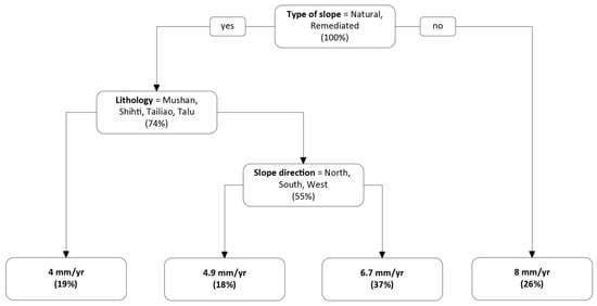 The first important factor, type of slope, represents the different condition that a slope is in (natural, bare, or remediated). If we group the erosion pins according to the type of slopes, it can be seen from Table 3 that they are close to evenly represented in the data. The bare slopes, with the condition that represents soil without vegetation and the absence of protection on the slope, tend to have higher amounts of soil mobilization and transport by water []. The average erosion depth is the highest for this group with 8.38 mm/yr. In contrast, the average erosion depth is the lowest in remediated slopes (5.19 mm/yr), which means that the remediation is successful in minimizing erosion. There are many methods for remediating slopes, such as changing slope lengths, improving drainage, and employing bioengineering stabilization methods. For natural slopes, the average erosion depth is 6.42 mm/yr, a value between the two extremes of bare slopes and remediated slopes. This is consistent with general conception and understanding.