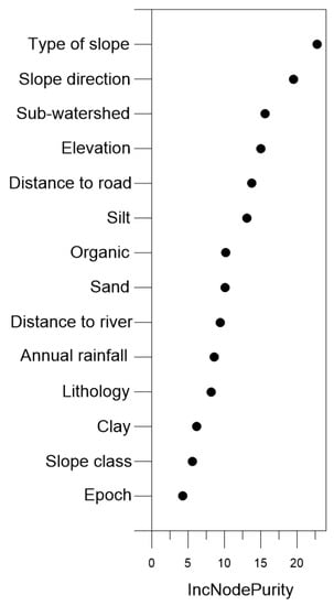 Since the random forest algorithm is the best performing model by all three statistical criteria (RMSE, MAE, and R2), the Mean Decrease Gini value is used to determine the top three most important factors among the 14 environmental factors, as shown in Figure 8. As can be seen from Figure 8, the three most important factors are type of slope, slope direction, and sub-watershed.
