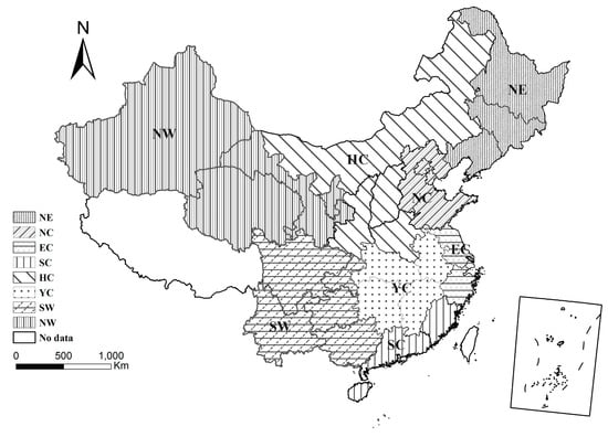 The data on carbon emissions comes from the China Emission Accounts and Datasets [34], and the data on employment amount comes from the China Population and Employment Statistics Yearbook 2008 and 2013 [35,36]. The employment amount is the number of formal employment in urban regions, excluding urban private and individual enterprises. The value added of each sector in each region in 2012 is provided by China Statistical Yearbook 2013 [37]. This article focuses on 30 provinces and municipalities of mainland China, excluding Tibet, Taiwan, Hong Kong and Macau due to lack of data. Besides, 30 provinces and municipalities are merged into eight regions based on the economic and geographic locations according to the Development and Reform Commission of the State Council [38], as shown in Figure 1. These regions are Northeastern (NE) region, including Liaoning, Jilin, and Heilongjiang, Northern Coastal (NC) region, including, Beijing, Tianjin, Hebei, and Shandong, Eastern Coastal (EC) region, including Shanghai, Jiangsu, and Zhejiang, Southern Coastal (SC) region, including Guangdong, Fujian, and Hainan, Middle of the Yellow River (HC), including Inner Mongolia, Shanxi, Henan, and Shaanxi, Middle of the Yangtze River (YC), including Hubei, Hunan, Jiangxi, and Anhui, Southwest (SW) region, including Chongqing, Sichuan, Yunnan, Guizhou, and Guangxi, and Northwest (NW) region, including Gansu, Qinghai, Ningxia, Tibet, and Xinjiang. In addition, the sectors are united into 30 industries, the sectoral classifications of which can be seen in S2.