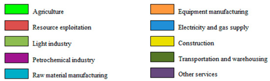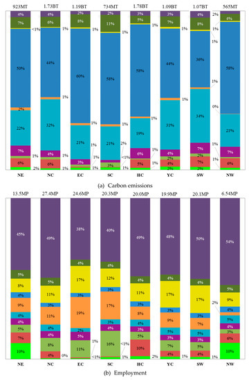 Sectoral share of carbon emissions and employment is shown in Figure 3. NC and HC had the largest carbon emissions in the country, which surpassed 1.7 billion tons in 2012, and NC and EC had the largest numbers of employment. The sectoral share of carbon emissions in regions differed from that of employment. Electricity and gas supply was the first source of carbon emissions in all regions, accounting for 36% to 60%, followed by raw material manufacturing, accounting for 19% to 34%. On the other hand, other services were the heaviest employment department in all regions, accounting for 38% to 54%, followed by construction and equipment manufacturing. It can be concluded that the sectoral share of carbon emissions was widely divergent from that of employment in regions.