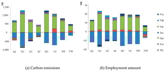 For regional employment amounts changes, the two factors of Fds and Ine dominated in promoting and restraining respectively, while Pte was a significant factor promoting employment in all regions except in NW. Other factors, such as Fse, Fdp, Epe, and Ese, played less important roles.