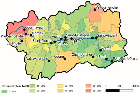 Map of Aosta Valley reporting the share of oil boilers on the total, based on the regional cadaster [22].