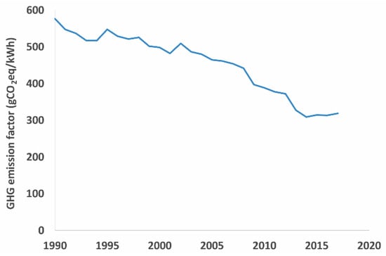 The reduction of CO2 by using heat pumps ranges from 54% to 76% compared to oil boilers, depending on the heat source (air, ground, ground water). These results are consistent with other studies on heat pumps with reference to the Italian electrical grid [52,54,55]. Other GHG like methane and nitrous oxide are abated by more than 90%. In addition, the GHG emission factor of electricity has declined of 32% between 2005 and 2016 [51] (Figure 2), thanks to the progressive phase out of liquid and solid fossil fuels in its production process, and a further reduction of GHG emissions is expected in the future, since the Italian government recently pledged to completely phase out coal as a source of energy by 2025 [56]. When compared to fossil fuels, GHG reductions achievable by using heat pumps systems are therefore likely to increase in the foreseeable future.