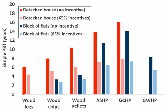 The economic convenience of the proposed solution was evaluated using a simple payback time (PBT), calculated as the ratio between the installation expense and the sum of the operational savings and the incentives granted. In Italy, the current incentive regime consists of a reimbursement of 65% of the expenses incurred, with a yearly payment over 10 years [60]. Payback time values without incentives were also calculated, to allow a comparison with other countries, and to consider possible variations in incentive schemes. The PBT values shown in Figure 3 range from about 6–16 years without incentives and from 3 to 8 years with the incentives described above. As expected, wood heating has a quicker return on investment than heat pumps due to low operational costs and to a lower initial investment required. Heat pumps require low-temperature heating terminals (fan coils, radiant panels or LTR) which are rarely present in old buildings, so their installation largely increases the initial investment. However, GWHPs are very competitive for larger dwellings, since they achieve very low operational costs with a reduced additional investment for well drilling.