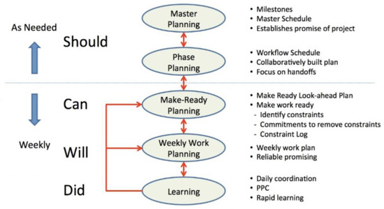 It conducted a systematic review of 102 papers pertinent to lean management in the construction sector [25]. The review identified the Last Planner System (LPS) and Just-in-Time (JIT) as the two most commonly used lean tools in the construction sector [25]. Standardization and detailed briefing were some of the least used strategies in lean management. LPS is a five-stage planning model (as shown in Figure 1), which moves from the milestone planning at the top-layer to daily reports and PPC (i.e., the periodic report) at the bottom-layer. The JIT approach is primarily based on waste-reduction and improving the response time [7]. While, the traditional approach is based on a cost-push strategy, the JIT approach is based on the demand-pull approach, where the intermediate stages are governed and timed as per the market need and demand.