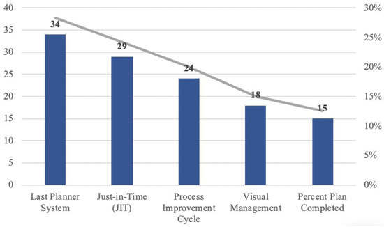 As it can be seen from Figure 3, a total of 34 participants (28.3%) selected the last planner system (LPS), when asked to choose the tool they are most familiar with or the one that is generally used when managing highway construction projects. This finding seconds the finding by Babalola, Ibem, and Ezema, who noted LPS as an essential and most widely accepted lean management tool in construction practices [25]. LPS was followed by JIT and PIC with a population rate of 24.1% and 20.0%. VM (15%) and PPC (12.5%) were identified as the least commonly used practices when managing highway construction projects.