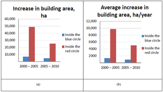 Based on the data for 2005–2010 from [31] and Chart 2 and Chart 3, we assumed Du = 5066 ha/year inside the red circle (Figure 1) and Du = 929 ha/year inside the blue circle (Figure 1).