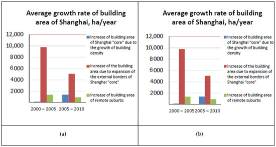 The dynamics of Shanghai housing development in 2000–2010 [31]: (a) The nominal increase in building area (ha) and (b) the average rate of development (ha/year).