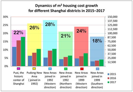 Dynamics of m2 housing cost growth for different Shanghai districts in 2015–2017 [27,51].