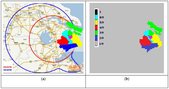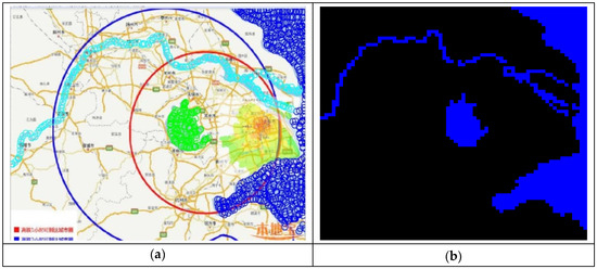 Processing the 2017 data for Shanghai and surrounding areas (400 × 400 km), taking into account the building density and landscape features [27]: (a) Inside the red circle is the area of high building density, and the belt from the red to the blue circle is the area of lower building density; (b) distribution of water (blue color) and land (black color) in the territory, given by the raster data model corresponding to (а).