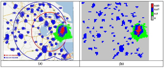 Population density zones of Shanghai and surrounding areas in 2017 (400 × 400 km): (a) Red marks the Shanghai core with the maximum population density (blue and green color denote reduced population density in Shanghai); the zone inside the red circle is the near suburbs, while the belt from the red circle to the blue circle is distant suburbs; (b) the distribution of the building density as a fraction per square kilometer, given by the raster data model corresponding to (а).