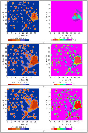 The function α(x,y) in Equation (1) is the activation parameter. An analysis of the system of Equation (1) [43,44,45,46] showed that with α = 0.3, the system describes an excitable medium, and with α = 1, it describes a non-excitable medium. In the model, we put α = 0.3 in the East direction. This numerical value was determined from regulatory acts of China, according to which 30% of geobiocoenoses should be maintained in developed areas. We put α = 1 in the non-excitable zones of the sea, Lake Taihu, and the Yangtze River.