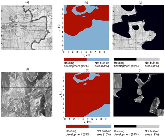 Expansion of Moscow near the Moscow River floodplain in 1952–1968: (a) 1960; a map of the considered region [54], (b) 1960; model calculations, (c) 1960; a map of the considered region with marked urban areas (building density over 55%); (d) 1968; a map of the considered region [54], (e) 1968; model calculations, (f) 1968; a map of the considered region with marked urban areas (building density over 55%).