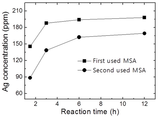 In the previous experiment, MSA and H2O2 were mixed and the optimum process was determined [19]. As shown in Figure 1, however, the reactivity of MSA for Ag extraction from solar cells was significantly reduced. The solubility of the Ag in the reused solution was reduced by about 15% even though the experiment was conducted for up to 12 h. This is because H2O was formed as a side reaction in the Ag extraction process using MSA and H2O2. The mechanism of the chemical reaction used to extract Ag with MSA and H2O2 is shown as follows [23].