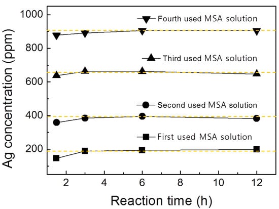We confirmed that concentration of MSA can be restored by fractional distillation as a result of FTIR. Figure 4 shows the Ag extraction behavior by repeated use of MSA by ICP-AES analysis as a function of the reaction time. The yellow dotted line in Figure 4 indicates that Ag is entirely dissolved in the solution. From this, we can see that in all the cases where MSA was reused, the yellow line is reached within 4 h. It is indicated that the reactivity of MSA and Ag was improved by all fractional distillation experiments. In other words, the MSA concentration was restored through fractional distillation, and it was confirmed that the Ag could be dissolved in the reused MSA.