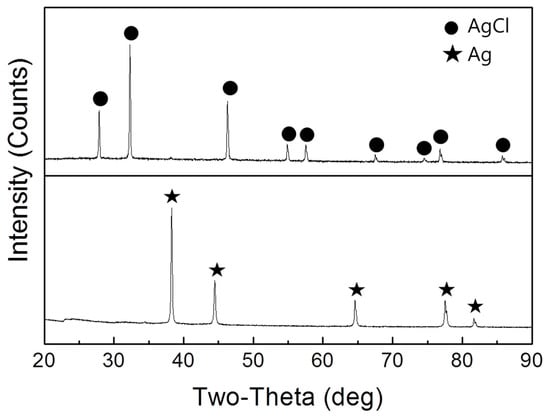 Figure 5 shows the XRD spectrums of AgCl recovered and Ag converted from AgCl by a wet chemical process. The converted Ag powder only shows the phase of Ag. As a result, pure Ag powder can be obtained using this simple chemical process. Table 4 provides a summary of the GDMS results for the purity levels of the as-recovered Ag powders. It can be confirmed that the Ag metal converted from AgCl had a purity of ~99.5% (2N), with an especially large amount of Cl and Pb present in the recovered Ag as impurities. It is expected that Pb dissolved due to the reaction of MSA solution and Pb. This is because Pb exists as a glass frit together with the Ag present in the solar cell [36]. Not only Ag but Pb also dissolves well in the MSA and H2O2 solution [37]. The dissolved Pb is considered to be precipitated together with PbCl2 when AgCl is leached by HCl [38]. For this reason, Pb and Cl were detected as 480 ppm and 4000 ppm in the GDMS analysis, respectively. In addition, it is expected that a large amount of Cl was detected in the Ag powder because not all of the AgCl was converted to Ag. As a result, 2N-grade Ag could be recovered from solar cells and it would be possible to recover higher purity Ag through the optimization condition of Ag conversion from AgCl and additional processes such as the electrochemical method.