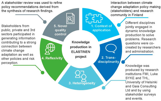 The most recent policy document outlining Finnish adaptation actions is the National Adaptation Plan 2022 [28]. Like the preceding national CCA policy document [21], the plan states that CCA is to be integrated into the planning and activities of relevant sectors and their actors. Actors are expected to have access to appropriate climate change assessments and risk management methods. This shall be achieved with research and development work and communication as well as education and training that can enhance the adaptive capacity of society, develop innovative solutions and improve the awareness of citizens on CCA [28]. One expression of this was the commissioning of the ELASTINEN project as part of the Government’s analysis, assessment and research activities managed by the Prime Minister’s Office, a government initiative started in 2014 to “generate information that supports decision making, working practices and management by knowledge” [33]. The purpose of the project was to provide a synthesis of available research and to deliver policy recommendations. The project can therefore be used to examine how knowledge production attributes can be observed in practice.