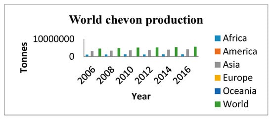 Despite the lack of well-organized selection programs, the global outlook of the chevon industry shows evidence of its tremendous potential to grow. The Food and Agriculture Organization Corporate Statistical Database(FAOSTAT), [22] in 2016, indicated that the total world meat production grossed 329,890,425 tonnes, of which chevon contributed 5,621,333 tonnes, which constituted 2% of the total world meat production (Table 3). Of this contribution, Asia and Africa produced approximately 95% of the total world chevon (Table 4). This high production of chevon from these two continents points to both the importance and potential of chevon to be among the elements of household food security [20]. The global chevon production from 2006 to 2016 increased by 23.12% (Figure 1). In terms of regions the percent increase in chevon production was 12.68%, 29.35%, −19.57% and −1.66 % in Africa, Asia, Europe and the Americas, respectively [22].