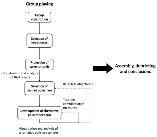 Depending on the number of participants, available time and number of facilitators, three versions of the game have been implemented to date: (1) by groups-1 session (~maximum 6–8 participants per group and facilitator), (2) assembly-1 session when the ratio of participants per facilitator is significantly higher, and (3) by groups-several sessions, the latter including reports to be delivered between the sessions to justify the choices taken. The main operative difference between the first 2 versions consists in the way decisions are taken in each case: per group by consensus (although a vote may be forced by the facilitator to unblock the situation), or by vote with the help of printed cards in the assembly version. The third version is substantially more time intensive for the participants and, to date, has been applied experimentally in a subject in an Engineering Faculty (see Table A1).An additional option would be the individual game, which has been performed internally by the members of the research group developing the game (see Discussion, Section 3).