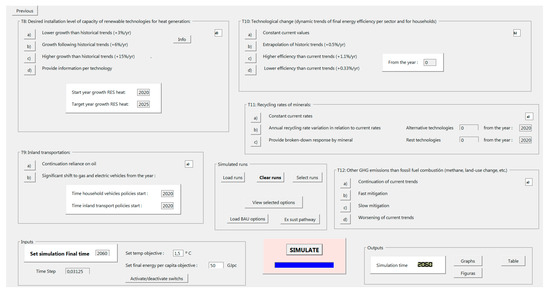 After selecting all the options, the facilitators proceed to the simulation of the scenario (it is also possible to choose the final year of the simulation), after which a file with the chosen name will be generated and it is possible to proceed to the results’ screens. At this point, it is also possible to load previously saved simulations.